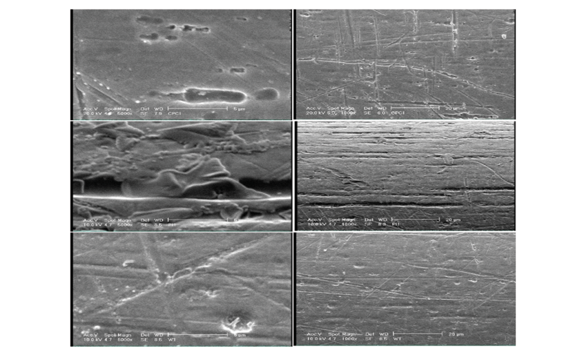 Figure-5 shows SEM micrographs of the surface of NiTi wires at x1000 and x5000 magnifications in the three groups. As shown, the surface was damaged in all three groups. NiTi wires exposed to PI showed larger surface defects in the form of pits, deeper grooves, and white corrosion products in the pits, compared with the CPC group. The wires in the CPC group showed a smoother surface. Wire surface destruction in the CPC group was insignificant compared with the distilled water group.