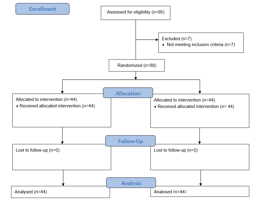 Ninety-five patients referred to the Taleghani Hospital, a referral teaching hospital in Tehran, Iran, were included in the study. Seven patients who did not meet the inclusion criteria or expired dropped out of the study. Ultimately, 88 patients remained until the end of the treatment period, as shown in Figure-1.
