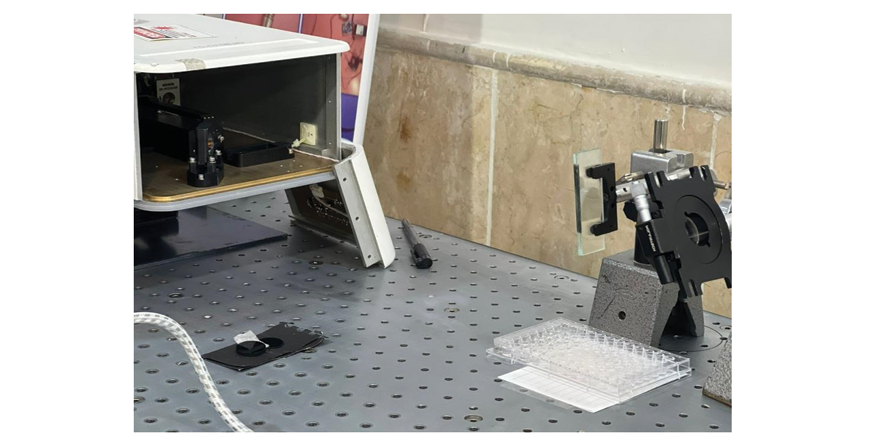Laser application was performed by directing pulses at the bacterial plates through a 1064 nm total reflection mirror. Glass slides were used to reduce energy: two slides reduced energy from 30 to 20 mJ, and four slides reduced energy from 30 to 10 mJ. The laser beam entered the optical fiber at a 45° angle to the optical center, with a focus diameter of 3 mm. Protective eyewear was used due to the invisible infrared wavelength.