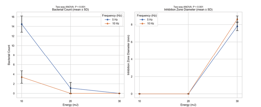 Figure 3 . Bacterial counts stratified by Enerjy and frequency (left); inhibition zone sizes stratified by enerjy and frequency (right)