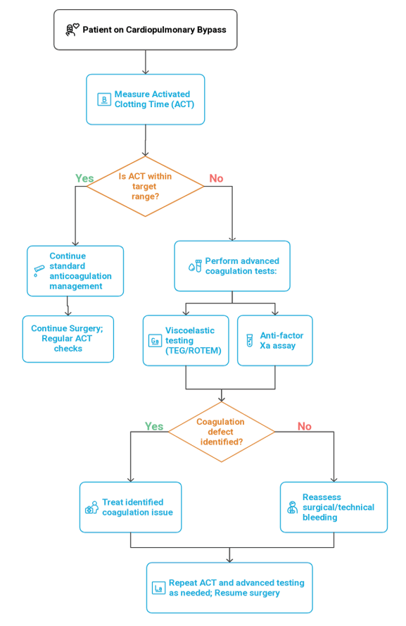Effective coagulation monitoring is essential in cardiac surgery to balance anticoagulation during CPB and manage bleeding post-bypass. A multimodal approach including ACT, anti-factor Xa assays, viscoelastic testing (TEG/ROTEM), and point-of-care (POC) devices offers both safety and specificity across diverse patient populations [26, 27]. Figure-1 illustrated the flowchart of coagulation monitoring.