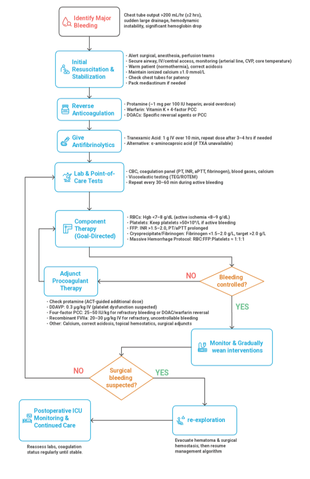 Effective bleeding control in cardiac surgery relies on a combination of pharmacologic agents, targeted transfusion strategies, anticoagulant reversal, and, when necessary, surgical re-exploration. Management should be goal-directed, based on clinical assessment and coagulation testing (e.g. TEG/ROTEM) [25]. Figure-2 demonstrated an algorithm for management of major bleeding in cardiac surgery.