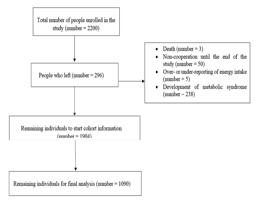 Inclusion criteria for participation were: (1) being an apparently healthy adult, (2) being aged between 18 and 65 years, and (3) being able to visit the local health center and complete the data collection questionnaire. Exclusion criteria were: (1) being a non-Iranian national, (2) being pregnant or breastfeeding, (3) Postmenopausal women, (4) having followed a specific dietary regimen within the preceding three months, and (5) having significant physical or mental disabilities that would impede the ability to visit a local health center or participate in data collection, (6) individuals who were on any chronic medication. Based on the initial sample size calculation, 1904 individuals were invited to participate. However, recruitment continued until a total of 2200 participants were enrolled. Subsequently, 58 participants were excluded due to mortality, lack of follow-through, reporting energy intake fell outside the plausible range, in addition 238 individuals were excluded from the study due to having MetS. Consequently, the final analysis included data from 1090 participants. A flowchart detailing participant enrollment and exclusions is presented in Figure-1.