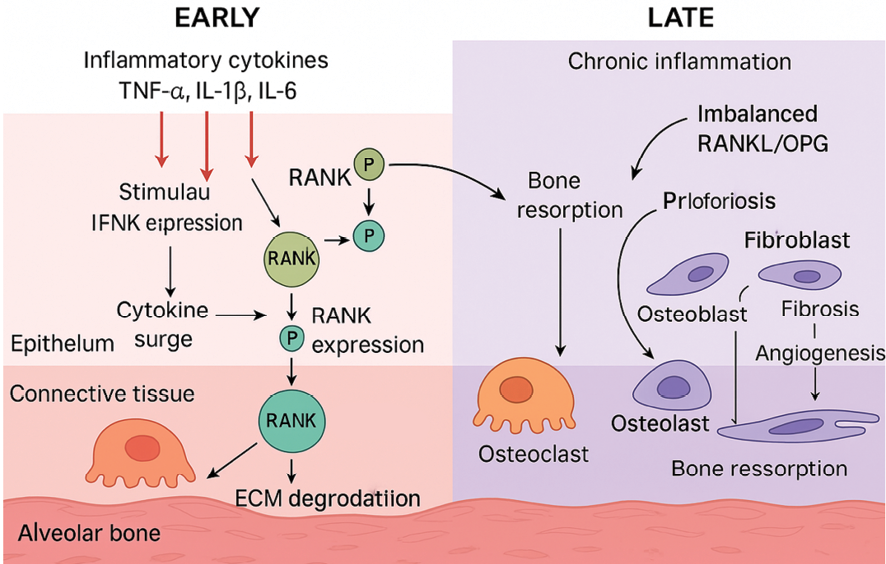 Figure 3. the dynamic molecular and cellular remodeling processes in periodontal tissue, divided into Early and Late phases. The Early phase depicts acute inflammation characterized by a surge of inflammatory cytokines (TNF-α, IL-1β, IL-6) leading to RANKL expression, activation of RANK on osteoclast precursors, ECM degradation via MMPs, and initial osteoclastogenesis. The Late phase illustrates chronic inflammation with an imbalanced RANKL/OPG axis promoting sustained osteoclast activity and bone resorption, accompanied by fibroblast proliferation, fibrosis, osteoblast recruitment, and angiogenesis. Cellular compartments such as epithelium, connective tissue, and alveolar bone are illustrated, with directional arrows indicating activation, and T-bars denoting inhibition or regulatory interactions. Phosphorylation events are marked with "P" symbols.