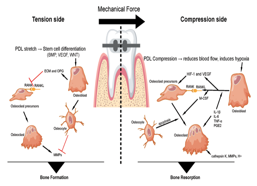 Figure 1. schematic illustrates orthodontic tooth movement under applied force, which generates a tension side and a compression side in the periodontal ligament and alveolar bone. On the tension side, osteoblasts (bone-forming cells) differentiate and secrete extracellular matrix proteins and osteoprotegerin (OPG), a decoy receptor that binds receptor activator of nuclear factor kappa-B ligand (RANKL), thereby inhibiting osteoclast activation. Osteocytes (mechanosensory cells embedded in bone) further support osteoblast function and bone deposition. On the compression side, osteoblasts release RANKL, which interacts with receptor activator of nuclear factor kappa-B (RANK) on osteoclast precursors, together with macrophage colony-stimulating factor (M-CSF), to promote their differentiation into mature osteoclasts. These multinucleated osteoclasts resorb bone through the secretion of matrix metalloproteinases (MMPs), cathepsin K, and hydrogen ions (H+). Additionally, osteocytes on the compression side may undergo apoptosis or secrete sclerostin, which inhibits osteoblast activity. The coordinated balance of bone formation on the tension side and bone resorption on the compression side enables controlled orthodontic tooth movement.