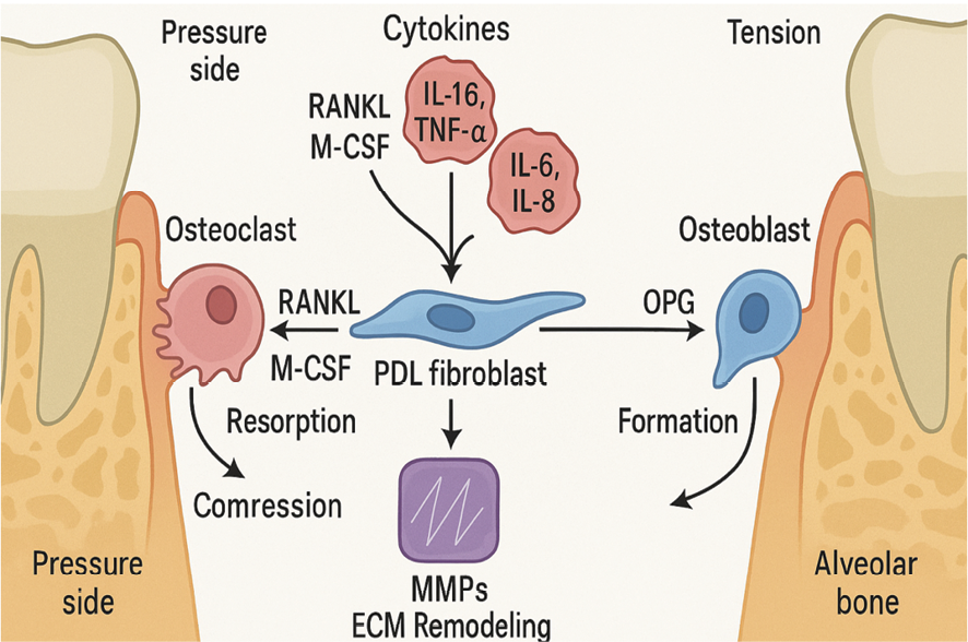 Orthodontic tooth movement (OTM) initiates a localized, aseptic inflammatory process in the periodontal ligament (PDL) and alveolar bone, driven by mechanical forces that lead to bone resorption on the pressure side and new bone formation on the tension side [1]. These forces alter blood flow and create hypoxic conditions in the PDL, triggering the release of inflammatory mediators and transient clinical signs such as redness, swelling, and pain responses essential for initiating tissue remodeling [2]. Periodontal cells, including PDL fibroblasts and osteocytes, act as mechanosensors. They respond to mechanical stress by secreting signaling molecules that recruit osteoclasts and osteoblasts to mediate bone resorption and deposition, respectively [2, 3]. While the classical "compression–tension" theory serves as a foundational concept, the precise molecular mechanisms that translate mechanical stimuli into coordinated remodeling remain under investigation. This biomechanical–biological interface is central to effective and safe orthodontic practice [2].