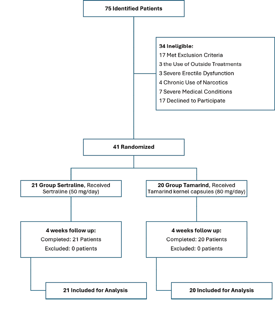 This randomized, double-blind, parallel-group superiority trial was designed to compare the efficacy of tamarind seed extract with sertraline in treating premature ejaculation. A sample size of 41 participants (20 tamarind, 21 sertraline) was determined based on a power analysis to detect a significant difference in PEDT scores between groups, assuming a power of 80%, a significance level of 0.05, and an effect size derived from prior studies. Participants were recruited from the urology clinic of Shahid Faghihi Hospital and the Psychiatric clinics of Shahid Motahari, Imam Reza, and Ebnsina Hospitals in Shiraz, Iran, using a permutation block design. The study was conducted from April 2024 to June 2024, with participant recruitment occurring from April 20, 2024, to June 22, 2024, and follow-up assessments completed by June 22, 2024. Trial sites were selected based on the availability of urology and psychiatric clinics; no specific eligibility criteria were defined for sites or interventionists. Before the study, the Institutional Review Board of the Shiraz University of Medical Sciences approved the experimental protocol (ID: IR.SUMS.MED.REC.1402.542). All subjects provided written informed consent. The trial was registered with the Iranian Registry of Clinical Trials (IRCT20140926019295N4, https://irct.behdasht.gov.ir/trial/76268) on 2024-04-09. The trial protocol is available upon request from the principal investigator (Ali Sahraian, sahraian@sums.ac.ir) or via the Ethics Committee of Shiraz University of Medical Sciences. No patients or public were involved in the design, conduct, or reporting of this trial. One change was made to the trial protocol after commencement: the IELT questionnaire was removed due to inadequate patient cooperation in completing the assessment.