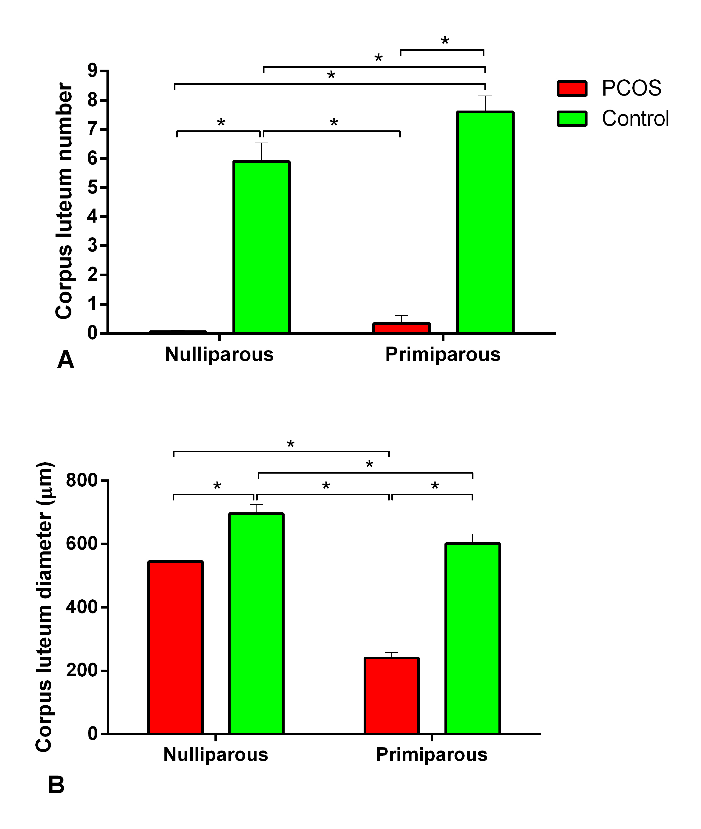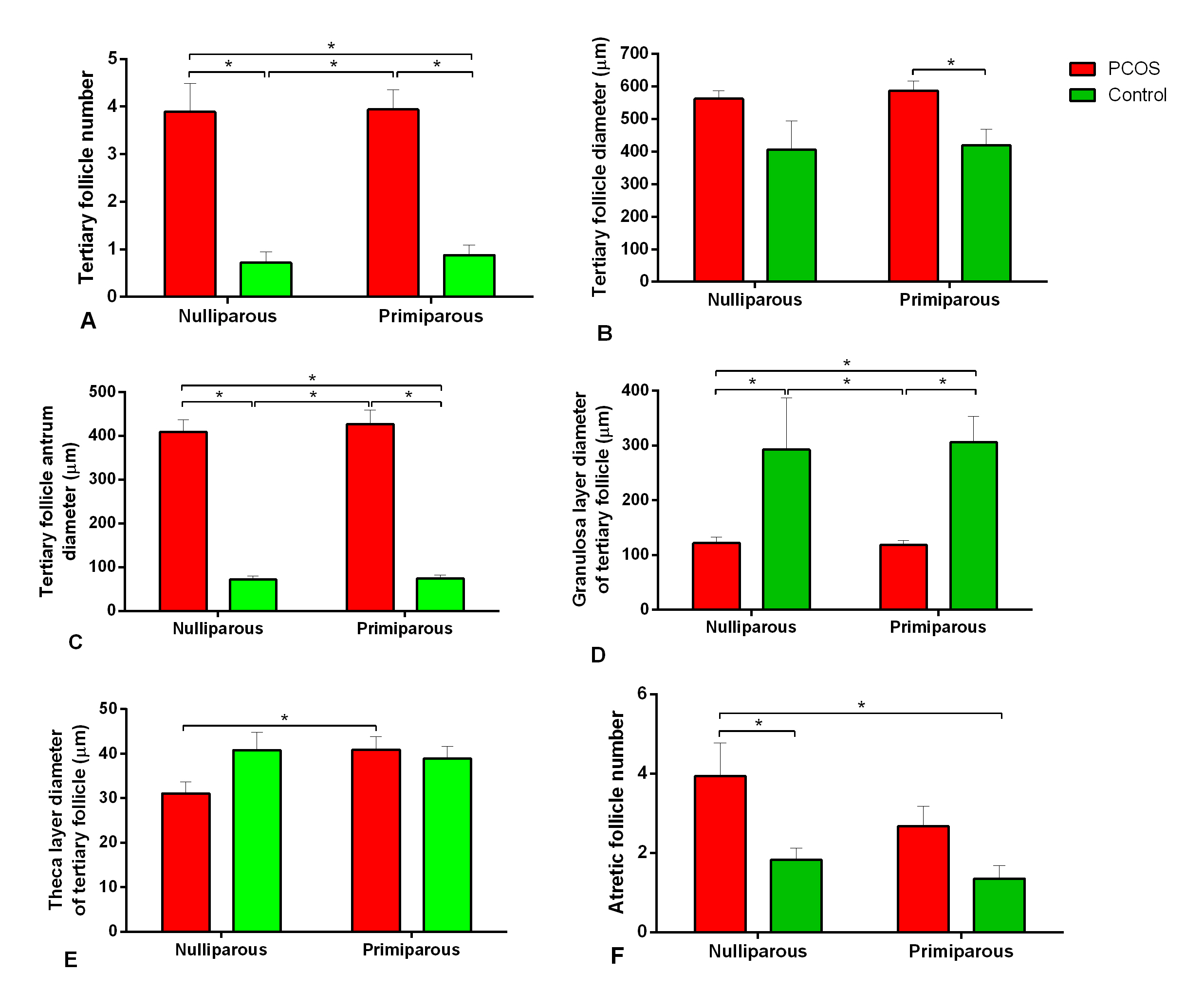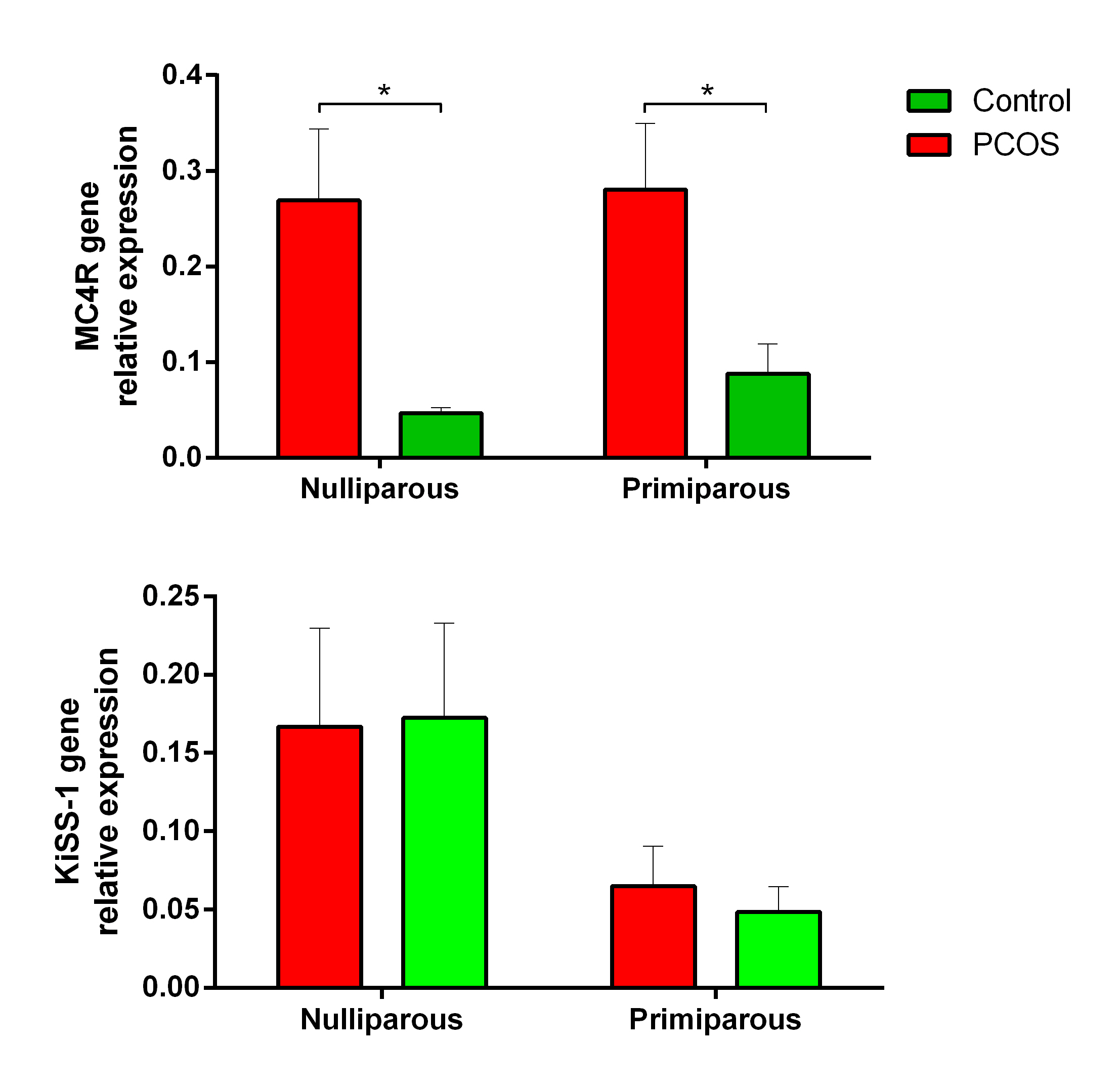 Results: Number of tertiary follicles and their size and number of atretic follicles in the PCOS subgroups were more than those in the controls (P<0.05) whereas the number of secondary follicles and corpus luteum in the PCOS subgroups were lower than those in the controls (P<0.05). Antrum and total diameters of tertiary follicles in the PCOS subgroups were greater and granulosa layer diameter was lower than those in the controls (P<0.05). The MC4R mRNA expression in the PCOS subgroups was 6.5-fold in nulliparous and 3.5-fold in primiparous groups more than their controls’ pairs (P<0.05). However, parity did not affect the expression of MC4R gene (P>0.05).The kiss1 mRNA expression in the PCOS and control subgroups was not significantly different (P>0.05).