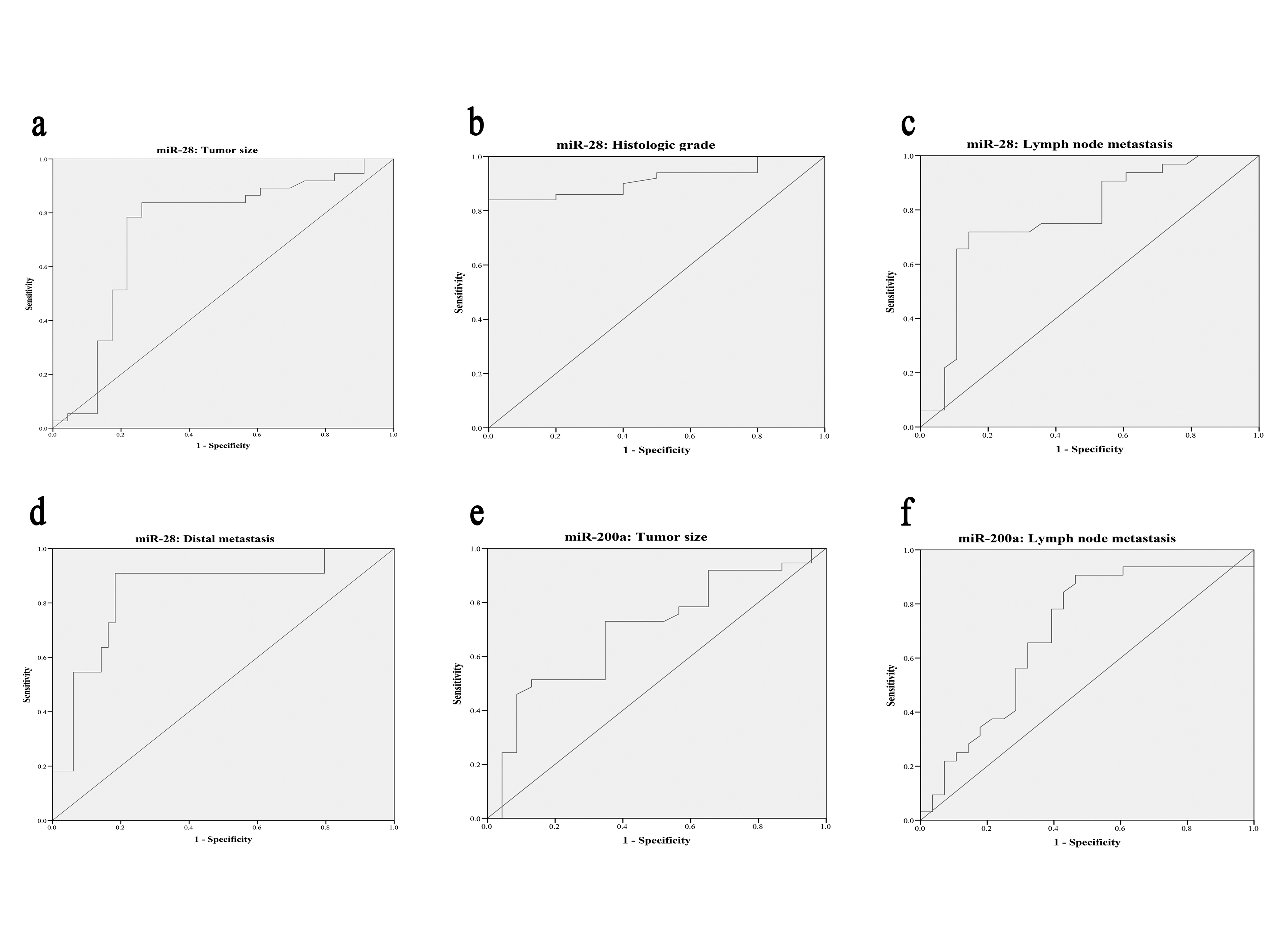 Background: MicroRNAs (miRNAs) play critical roles in different pathological processes including cancer development and progression. To find novel molecular diagnostic and prognostic markers and promising therapeutic tools for gastric cancer (GC), we aimed to investigate the relationship of the expression levels of miR–28–5p or miR–200a–3p with the clinicopathological criteria and to explore their impacts on the progression of human GC. Materials and Methods: Quantitative RT–PCR was performed to analyze miR–28 and miR–200a expression in 60 GC and 60 non–GC tissue samples. Result: Our results revealed that the expressions of miR–200a and miR–28 were significantly downregulated in GC in comparison with non–GC tissues. Tumors with low miR–28 expression had larger tumor size, more advanced histological grade, and a higher incidence of lymph node and distal metastasis than the tumors with high miR–28 expressions. Furthermore, receiver operating characteristic (ROC) analyses demonstrate that the expression of miR–28 is a predictive biomarker allows predicting the histological grade, tumor size, and occurrence of nodal and distal metastases. We also found a significant inverse association between miR–200a expression and the rate of lymph node metastasis (p = 0.010, r = –0.334). Conclusion: Our findings suggest that the miR–28 and miR–200a have tumor–suppressor functions and may be considered as potential biomarkers for gastric cancer diagnosis and prognosis.[GMJ.2019;8:e1329]