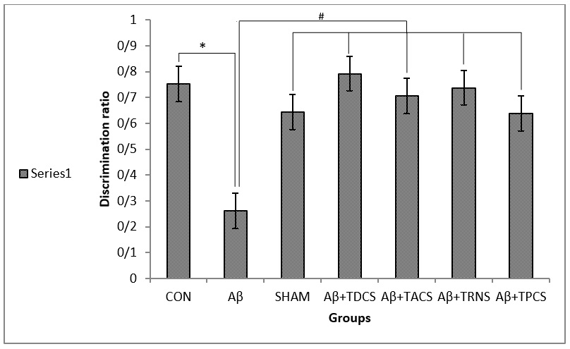 Background: Treatment of Alzheimer as a disease that is associated with cognitive impairment has been associated with some restrictions. Recently, researchers have focused on non-pharmacological treatments, including non-invasive stimulation of the brain by transcranial electrical stimulation (tES). Four main paradigms of transcranial electrical current include transcranial direct current stimulation (tDCS), transcranial alternative current stimulation (tACS), transcranial random noise stimulation (tRNS), transcranial pulse current stimulation (tPCS). The tDCS is a possible new therapeutic option for patients with cognitive impairment, including Alzheimer disease. Materials and Methods: The study was done on Sprague-Dawley male rats weighing 250-270 g. to develop Alzheimer’s model, the cannula was implanted bilaterally into the hippocampus. Aβ 25-35 (5μg/ 2.5µl/day) was microinjected bilaterally for 4 days. Then, an electrical stimulation paradigm was applied to the animal for 6 days. Animal cognitive capacity was evaluated on day 11 and 12 by novel object recognition (NOR) test. Results: Our results showed that application of tDCS; tACS; tRNS and tPCS reversed beta-amyloid-induced impairment (P<0.05). The tRNS Group spent total exploration time around the objects compared to other groups (P<0.05). There was no significant difference between the four different paradigms in discrimination ratio and the percentage of total exploration time. Conclusion: The results of this study showed that the use of multiple sessions of different tES paradigms could improve Aβ-induced memory impairment in the NOR test. Therefore, based on evidence, it can be expected that in addition to using tDCS, other stimulatory paradigms may also be considered in the treatment of AD. [GMJ.2019;8:e1440]