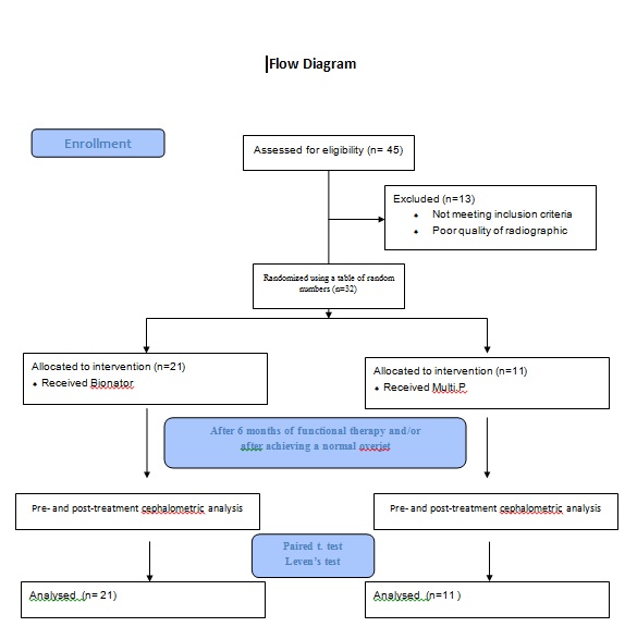 Subjects and methods: 45 class II children were chosen and randomly assigned to either the Bionator or Multi-P treatment group. After excluding 13 patients from the study, 21 patients in Bionator and 11 patients in Multi-P group have participated in the study. Lateral cephalograms were analyzed at the beginning (To) and at the end of treatment (T1) to evaluate the changes in both groups. The paired t.test and Leven’s test were enrolled for statistical analysis.