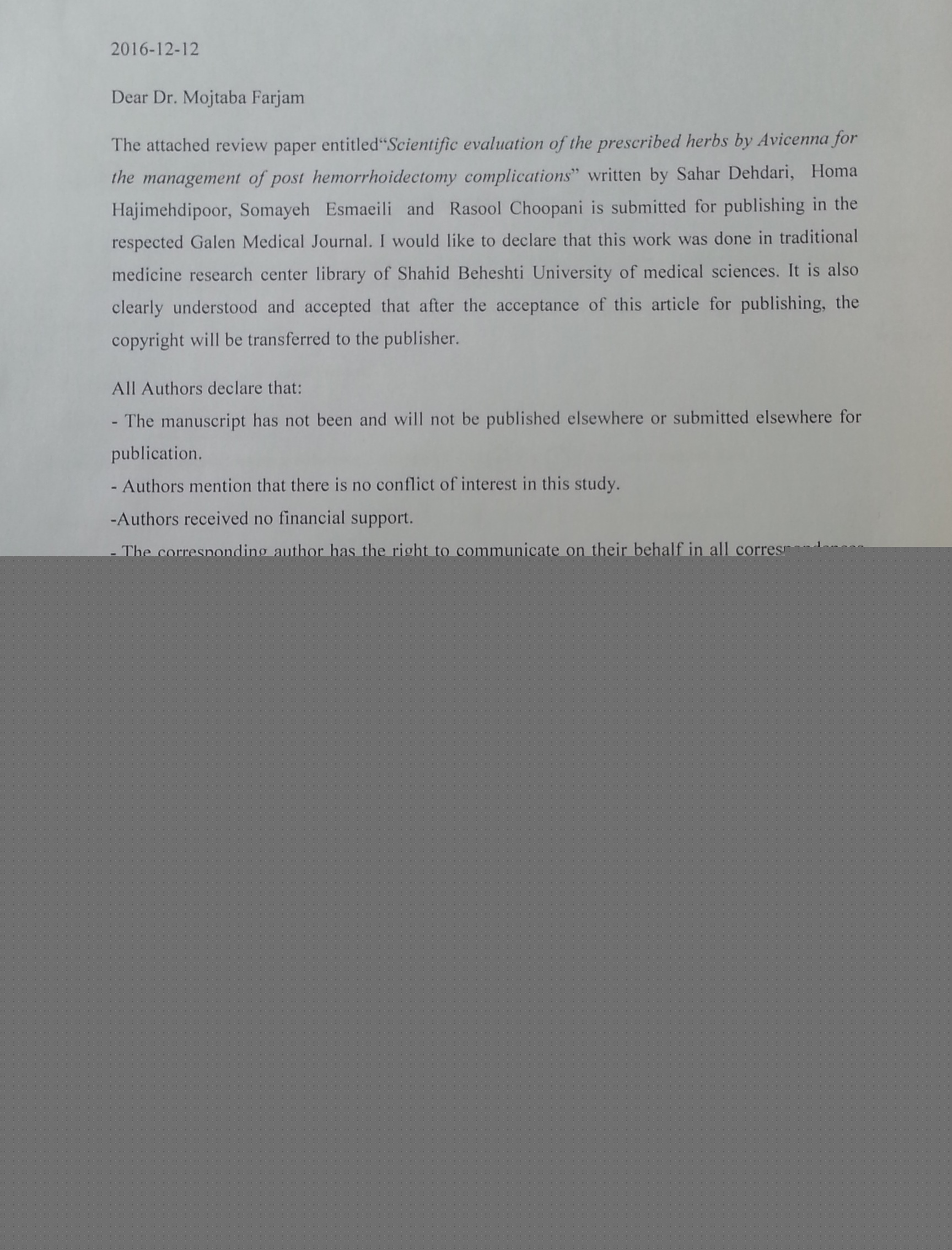 Scientific Evaluation of the Prescribed Herbs by Avicenna for the Management of Post Hemorrhoidectomy Complications